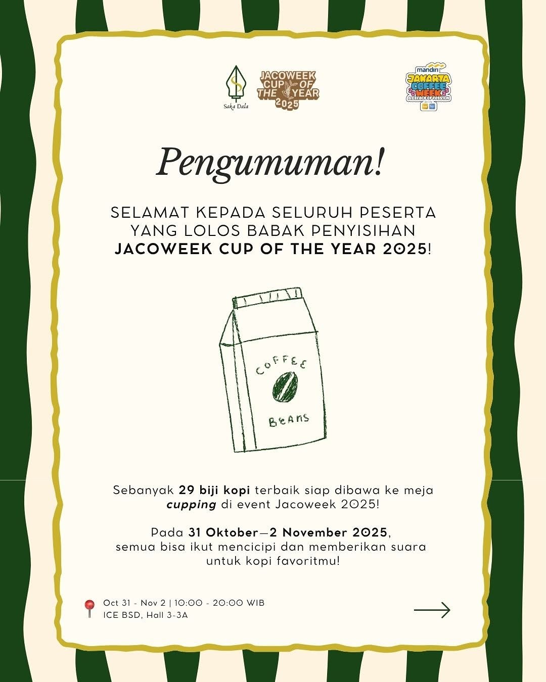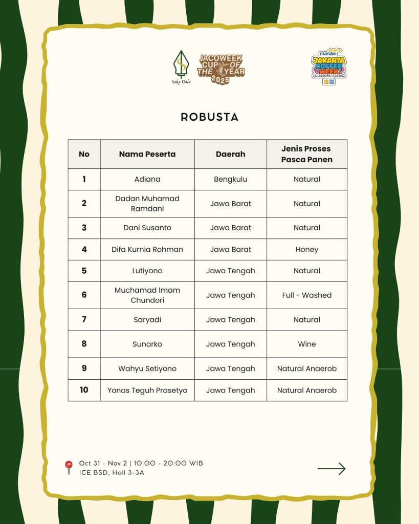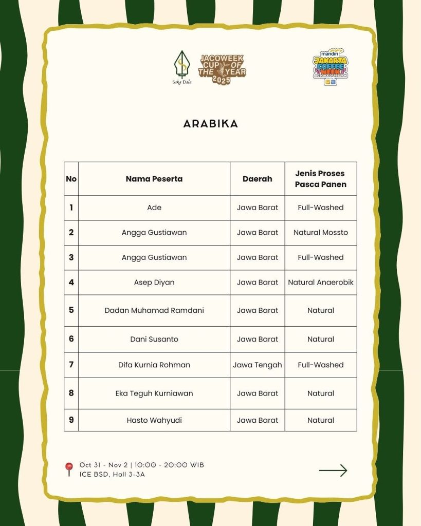 Ajang tahunan bergengsi yang akan digelar di ICE BSD, Hall 3–3A pada 31 Oktober hingga 2 November 2025 ini mempertemukan 29 biji kopi terbaik dari seluruh Indonesia, hasil seleksi ketat dari berbagai daerah. Dalam pengumuman resmi panitia, Merta Kopi yang diwakili oleh Dadan Muhammad Ramdani asal Jawa Barat berhasil menembus dua kategori sekaligus — Arabika (Natural Process) dan Robusta (Natural Process).