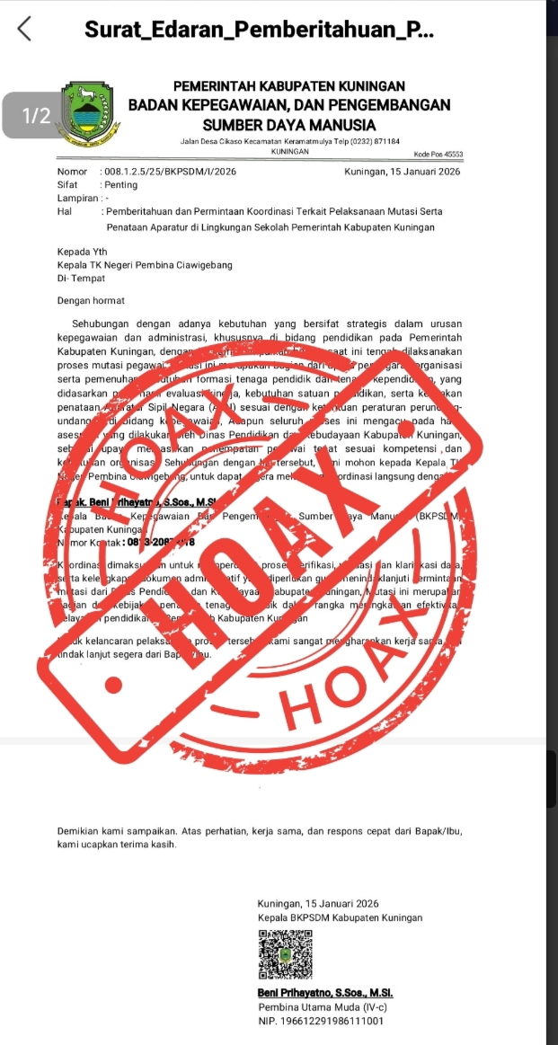 Melalui Kepala Bidang Informasi dan Komunikasi Publik Diskominfo Kabupaten Kuningan, Kepala BKPSDM Kuningan Beni Prihayatno, S.Sos., M.Si., menegaskan bahwa surat tersebut tidak berasal dari BKPSDM dan tidak memiliki dasar administratif yang sah.